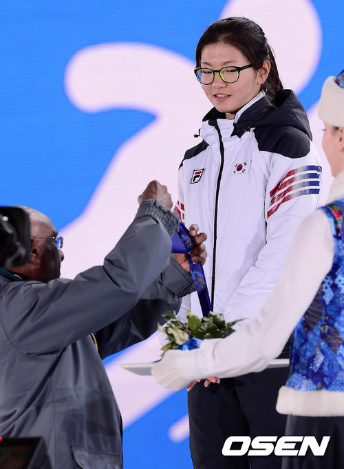 여자 쇼트트랙의 간판 심석희가 16일(이하 한국시간) 러시아 소치 해안 클러스터 내 올림픽 파크 메달 프라자에서 열린 시상식에서 은메달을 수상하고 있다.
