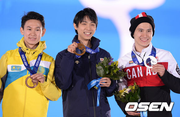 16일(이하 한국시간) 러시아 소치 해안 클러스터 내 올림픽 파크 메달 프라자에서 열린 시상식에서 데니스 텐, 하뉴 유즈루, 패트릭 챈이 포즈를 취하고 있다.
