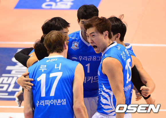 우리카드는 16일 구미박정희체육관에서 열린 NH농협 2013-2014 V-리그 LIG손해보험과 경기서 세트스코어 3-0(25-23, 25-20, 25-19)으로 완승을 거뒀다.