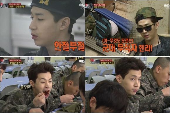 영화로 군생활을 배운 그는 군대용이라며 선글라스를 가져오고, 건강을 체크하는 질문에 긴장감 때문에 가슴이 두근댄다고 말하는가 하면 키를 묻는 질문에 아침에는 "0.2cm가 더 크다"고 답하는 등 군 문화를 전혀 모르는 모습이었다.