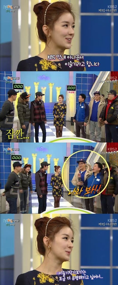 이날 MC로 허참과 함께 이슬기 아나운서가 등장했다. 멤버들은 '1박2일'의 '수지 닮은꼴' 미녀 작가인 이슬기 작가와 동명이인인 이슬기 아나운서에 관심을 보였다.
