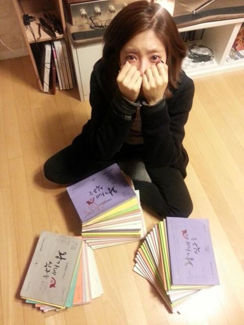 이윤지는 17일 오전 자신의 사회관계망 서비스 트위터에 "밤늦도록 잠 못 이루었더랬다. 방송 한 시간 내내 울고 끝나고 생각하며 울고. 울고 울고. '왕가네 식구들' 대본 50권과 함께 모두에게 감사를 전한다. 광박이 안녕, 흑흑"이라는 글과 함께 사진 한 장을 게재했다.