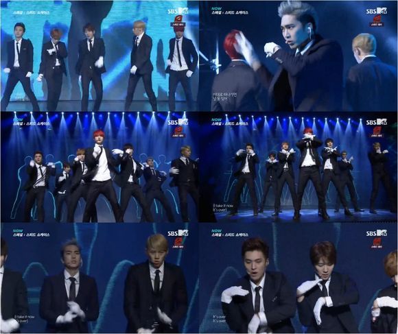 이날 스피드 멤버들은 딱 달라붙는 정장 차림으로 각이 살아 있는 ‘칼군무’를 보여줬다. 이들은 세련되면서도 남성미가 물씬 풍겨나는 분위기 속에 완벽하게 떨어지는 안무로 카리스마를 뽐냈다.