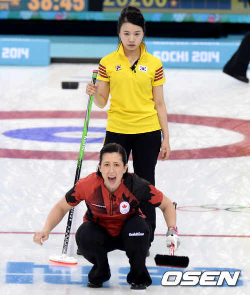 '맏언니' 신미성(36)을 비롯해 김지선(28), 이슬비(26), 김은지(25), 엄민지(23, 이상 경기도청)로 구성된 여자 컬링대표팀(세계랭킹 10위)은 18일(이하 한국시간) 러시아 소치의 아이스큐브 컬링센터에서 열린 컬링 여자 라운드 로빈 세션 12 캐나다(세계랭킹 2위)와 경기서 4-9로 패했다.