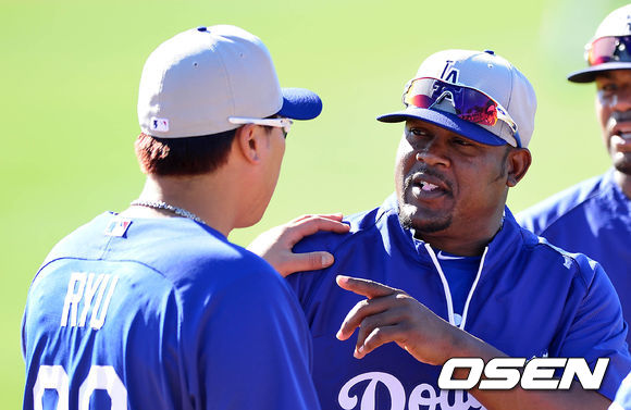 다저스 후안 유리베가 류현진과 이야기를 나누고 있다.