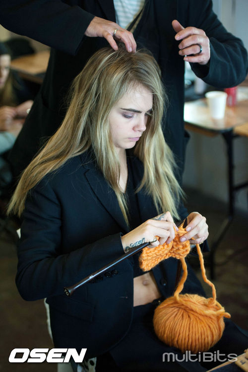 [OSEN/WENN 특약] 17일(현지시간) 영국 런던에서 열린 '런던 패션위크 A/W 2014-자일스' 런웨이에서 영국의 모델 카라 델레바인이 백스테이지에서 뜨개질을 하고 있다.
