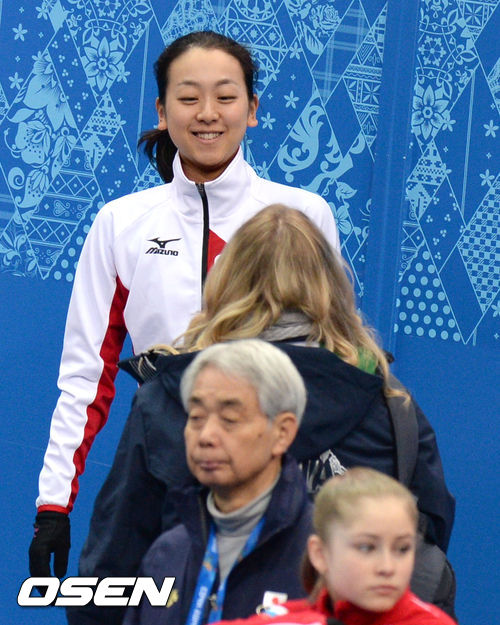 러시아 율리아 리프니츠카야가 18일(한국시간)러시아 소치 해안클러스터 내 스케이팅 트레이닝 센터에서 훈련을 위해 입장한 후 경기장을 바라볼때 아사다 마오가 율리아 리프니츠카야 근처에서 웃고 있다.