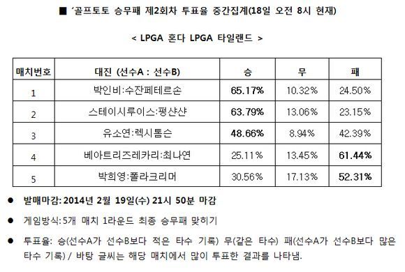 LPGA 혼다 LPGA 타일랜드 대상 골프토토 승무패 2회차 투표율 중간집계 결과