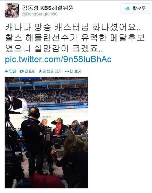 김동성 KBS 해설위원이 찰스 해믈린(30, 캐나다)의 탈락을 지켜봐야했던 캐나다 캐스터의 현황을 중계해 화제다.