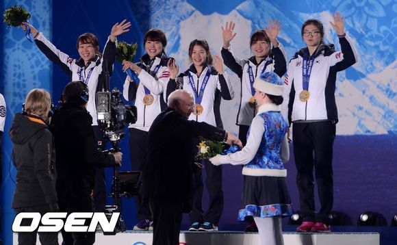 경기를 마치고 19일(한국시간) 러시아 소치 해안 클러스터 내 올림픽 파크 시상식에서 쇼트트랙 여자 계주 시상식이 진행되고 있다. / soul1014@osen.co.kr