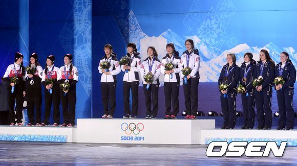 경기를 마치고 19일(한국시간) 러시아 소치 해안 클러스터 내 올림픽 파크 시상식에서 쇼트트랙 여자 계주 시상식이 진행되고 있다. / soul1014@osen.co.kr