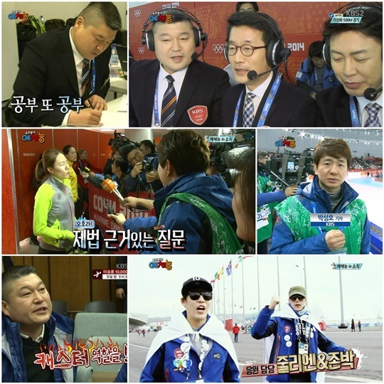 지난 18일 방송된 '우리동네 예체능'에서는 소치 동계 올림픽 안팎에서 생생한 현장감을 안방극장에 고스란히 전달하기 위해 직접 발로 뛰며 온 몸으로 대표팀 선수들을 응원한 강호동, 박성호, 줄리엔 강, 존박 등의 모습이 그려졌다.