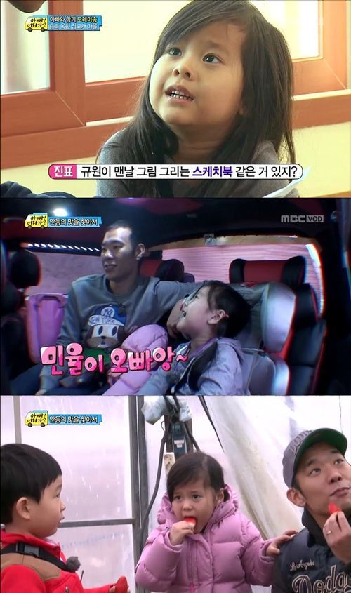 MBC 예능프로그램 ‘일밤-아빠 어디가’에 출연 중인 가수 김진표의 딸 김규원이 애교 넘치는 모습을 조금씩 보여주며 안방극장을 녹이는 중이다.