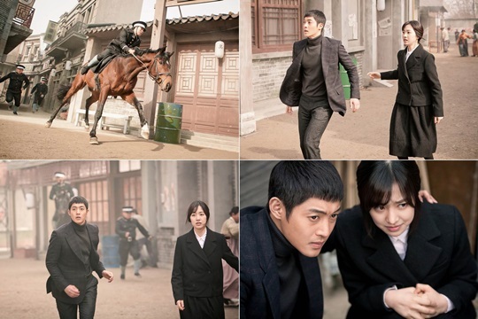19일 공개된 사진 속에는 정태(김현중 분)와 옥련(진세연 분)이 기마순사에게 쫓기는 모습이 담겼다. 검은색 정장을 갖춰 입고 있는 정태와 옥련은 '상하이의 매'라고 불린 정태 아버지 영출(최재성 분)의 장례에 참석한 것으로 예상된다.