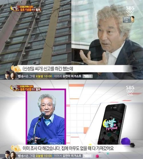 19일 오후 8시 55분 방송된 SBS '한밤의 TV연예'에는 신성일이 4일 동안 집을 비운 사이 자택에 도둑이 든 사건이 전파를 탔다.