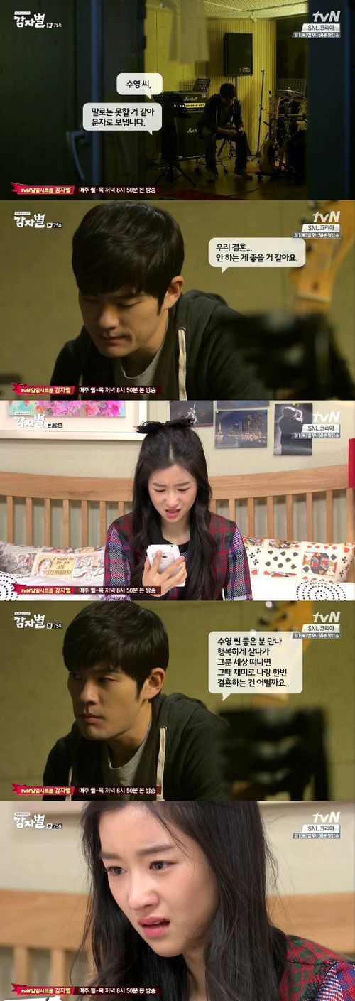 19일 오후 방송된 tvN '감자별 2013QR3'(이하 '감자별') 75회에는 노수영(서예지 분)에게 이별을 선언하는 장율(장기하 분)의 모습이 전파를 탔다. 두 사람은 결혼까지 계획한 사이였지만, 수영의 어머니 왕유정(금보라 분)의 반대로 결국 헤어졌다.