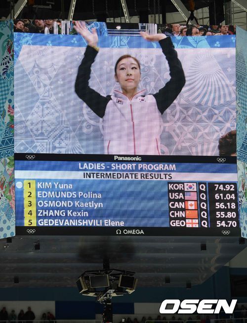 김연아는 20일(이하 한국시간) 러시아 소치의 아이스버그 스케이팅 팰리스에서 열린 2014 소치 올림픽 피겨스케이팅 여자 싱글 쇼트프로그램에서 기술점수(TES) 39.03점, 예술점수(PCS) 35.89점을 받아 총점 74.92점을 기록해 1위에 올랐다. 2위 아델리나 소트니코바(18, 러시아)와는 0.28점 차이.
