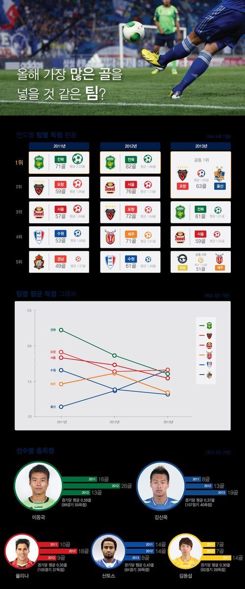 최근 3년 동안 경기당 평균 가장 많은 골을 득점한 팀은 '닥공'의 주인공 전북이다. 전북은 최근 3년간 총 214골을 득점했다. 경기당 평균 1.9골을 뽑아냈다. 통계상 2011년 이후 전북의 경기당 평균 득점은 감소하고 있다. 2011년 경기당 평균 2.22골을 기록했던 전북은 2012년 경기당 평균 1.86골, 2013년에는 경기당 평균 1.61골로 수치가 감소했다. 하지만, 전북은 올해 '닥공의 창시자' 최강희 감독이 대표팀에서 복귀하며, 다시 한번 화끈한 공격 축구를 선보일 것으로 기대를 모은다.
