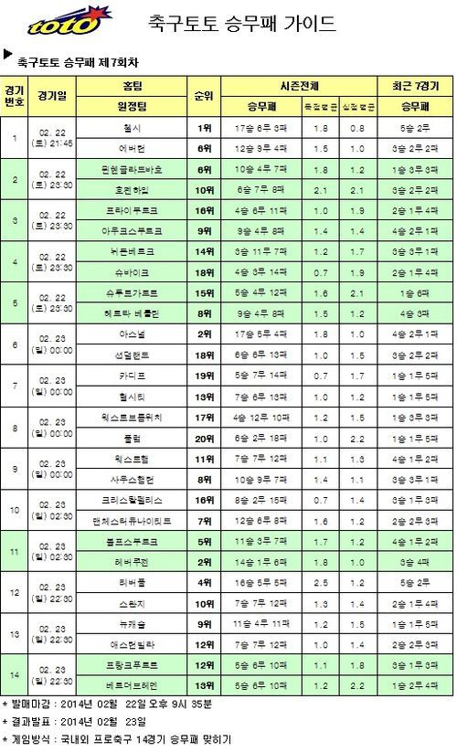 축구토토 승무패 7회차 게임은 22일 오후 9시 35분에 발매가 마감되며 상세한 일정은 스포츠토토 및 스포츠토토 공식 온라인 발매 사이트인 베트맨에서 확인할 수 있다.