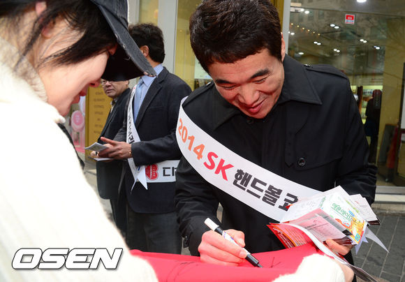 2014 SK 핸드볼 코리아리그 개막을 앞두고 감독과 선수들이 20일 오전 명동 거리홍보에 나섰다.