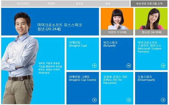 이번에 선보인 유스스파크 공식 홈페이지(http://is.gd/OI2Z2o)를 방문하면 한국 마이크로소프트가 7세부터 24세의 청소년을 위해 지원하는 모든 프로그램을 한 눈에 확인해 볼 수 있다. 특히 어린이, 청년 등 자신의 연령에 맞게 설계된 프로그램의 소개, 그리고 다가오는 행사의 일정과지원방법 등이 쉽게 설명되어 있다.