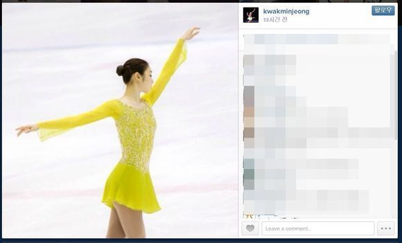 곽민정은 20일 새벽 자신의 인스타그램에 쇼트 의상을 입고 있는 김연아의 사진을 올려 응원 메시지를 보냈다. 별다른 말 없이 사진만 올렸으나 경기를 지켜보며 김연아를 응원하고 있음을 알 수 있는 '메시지'였다.