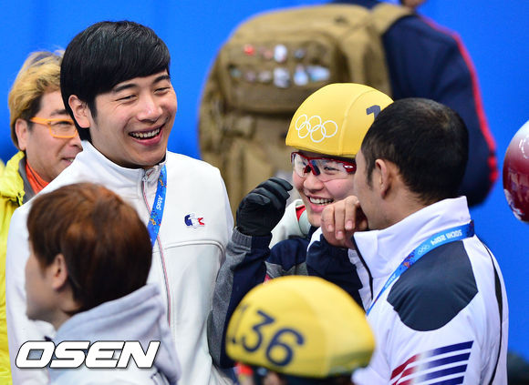 훈련 전 조항민 프랑스 쇼트트랙 대표팀 감독이 한국 쇼트트랙 국가대표 박승희, 최광복 코치와 즐겁게 얘기를 나누고 있다.