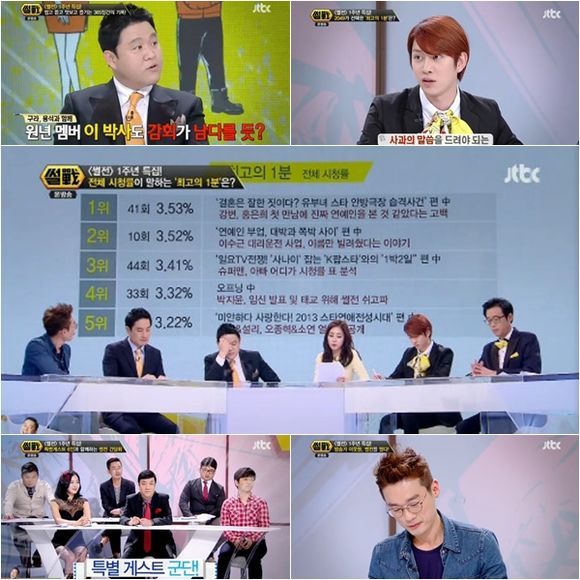 지난 20일 오후 방송된 JTBC '썰전- 예능심판자'에는 초대 게스트들과 함께하는 ‘썰전’ 1년을 자아비판 시간이 전파를 탔다. ‘썰전’ MC들은 대중들의 무관심 속 시작된 ‘썰전’의 성장을 자축하면서도, 특별게스트와 함께 시청률 3%를 넘기지 못하는 한계를 날카롭게 분석하고 반성했다.