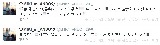 그러자 안도 미키는 자신의 트위터를 통해 경기 전 "연습에서는 얼굴에서부터 정신을 바짝 차린 듯한 인상, 이대로 빛나주길 바란다"고 염원했다. 이어 경기를 마치자 "최고!!!!! 고마워!!! 이제야 비로소 그녀다운 연기를 펼친 것 같다!"며 감탄했다.
