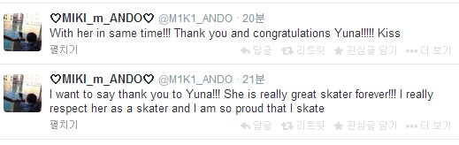 이에 안도 미키는 자신의 트위터를 통해 "연아에게 감사하다고 말하고 싶다. 그녀는 정말 영원히 대단한 스케이터였다"고 아쉬워했다. 이어 안도 미키는 "한 명의 스케이터로서 진정으로 그녀를 존경하고 있고 그녀와 동시대에 스케이트를 탔다는 것이 자랑스럽다"며 "고맙고 축하한다 연아. 키스"라며 글을 마쳤다.