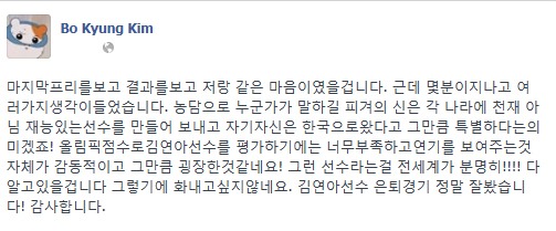 이어 "올림픽 점수로 김연아 선수를 평가하기에는 너무 부족하다. 연기를 보여주는 것 자체가 감동적이고 그만큼 굉장한 것 같다. (김연아가) 그런 선수라는 걸 전세계가 분명히!!! 다 알 고 있을 것이다. 그렇기 때문에 화내고 싶지 않다. 김연아 선수 은퇴경기 정말 잘 봤습니다. 감사합니다"라며 김연아에 대한 고마움을 밝혔다.