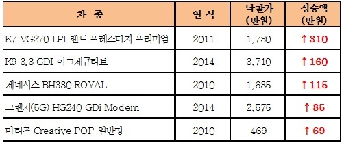 총 출품 차량은 331대로 이 중 188대가 낙찰됐으며 고객의 희망가 대비 낙찰가가 상승한 주요 차량은 표와 같다.