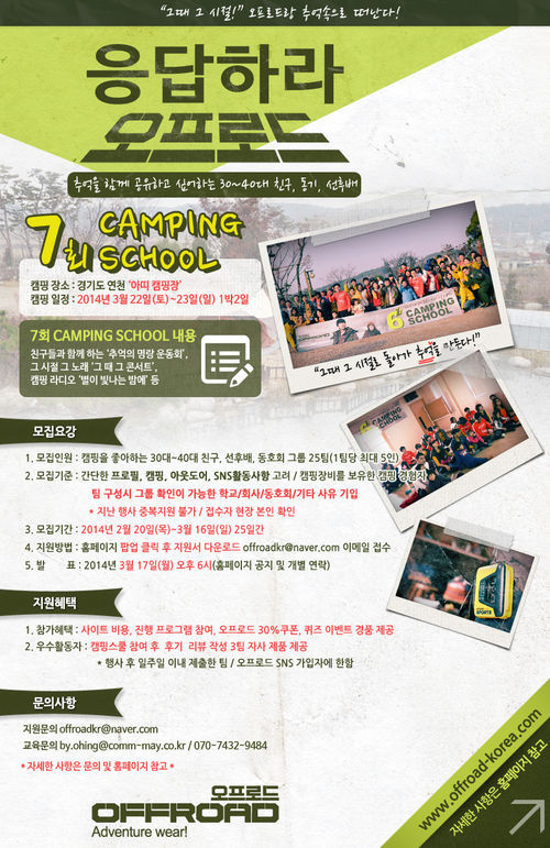 ‘오프로드 제7회 캠핑스쿨’은 경기도 연천군에 위치한 ‘아띠 캠핑장’에서 내달 3월 22일부터 3월 23일까지 1박2일로 진행된다. 이번 캠핑스쿨은 ‘응답하라 오프로드’라는 주제로 그때 그 시절로 떠나는 추억의 캠핑으로 진행된다. 캠핑참가자도 30대~40대 동기, 친구, 동료, 동호회원 등 텐트 설치가 가능하고 장비를 보유한 캠핑 경험자들로 구성된 25개팀을 대상으로 한다.