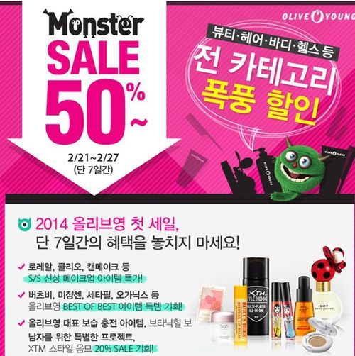 올리브영은 21일부터 27일까지 최대 50% 할인하는 ‘몬스터 세일’을 한다. 올리브영의 ‘몬스터 세일’에 따르면 기초와 색조를 가리지 않고 향수, 헤어, 바디, 헬스 등 모든 품목을 대상으로 할인이 적용된다.