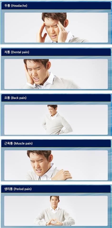 전문 연기자는 아니지만 사진 속에서 두통 치통 요통 근육통을 연기하는 박태환의 표정과 몸짓은 매우 진지했다. 두통은 두 손으로 관자놀이를 누르고 있는 모습으로, 치통은 이를 악물로 오른 손으로 한쪽 볼을 만지고 있는 제스처로 고통을 표현하고 있다.
