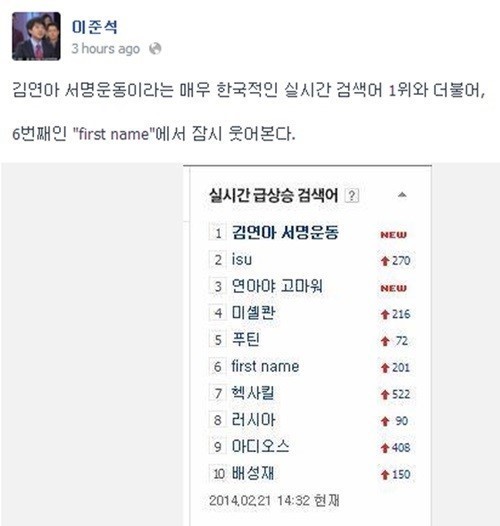 이준석은 21일 자신의 페이스북에 "'김연아 서명운동'이라는 매우 한국적인 실시간 검색어 1위와 더불어 6번째인 'first name(퍼스트 네임·이름)'에서 잠시 웃어본다"는 글을 남겼다.