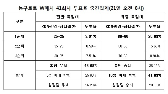 KDB생명의 승리를 예상한 참가자는 38.14%였고, 하나외환의 승리에 투표한 참가자는 20.79%로 집계됐다.