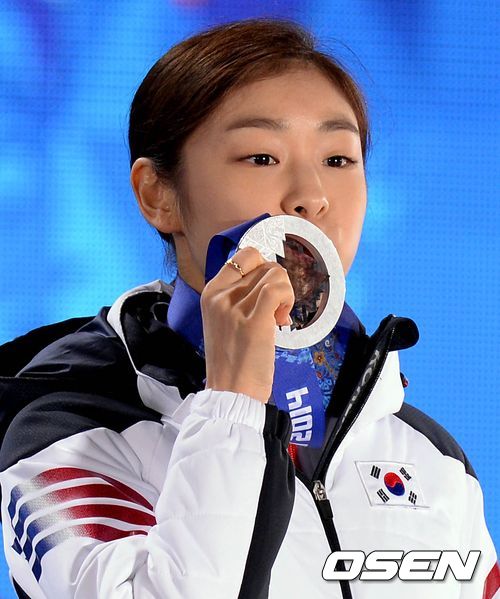 22일 (이하 한국시간) 러시아 소치의 메달프라자에서 열린 2014 소치올림픽 메달 시상식에서 김연아가 은메달을 수상하고 있다.