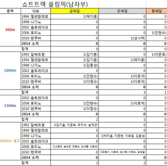 한국이 올림픽 쇼트트랙에서 첫 금메달을 얻기 시작한 1992 알베르빌 대회부터 남자 쇼트트랙 대표팀은 매 올림픽마다 2개 이상의 금메달을 얻어냈다. 아무런 메달도 없었던 것은 2002 솔트레이크시티 대회가 전부였다.