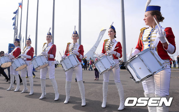 22일(한국시간) 러시아 소치 해안클러스터 올림픽 파크에서 군악대 공연이 펼쳐지고 있다.