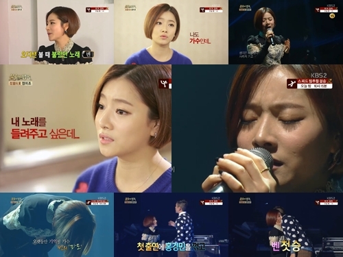 [OSEN=임승미 인턴기자] 벤의 재발견이었다. KBS 2TV 예능프로그램 '불후의 명곡-전설을 노래하다'(이하 '불후의 명곡')에 첫 출연한 걸그룹 베베미뇽의 리드보컬 벤은 자신의 목소리를 많은 시청자들에게 알리며 5년 무명생활의 설움을 떨쳐버렸다.