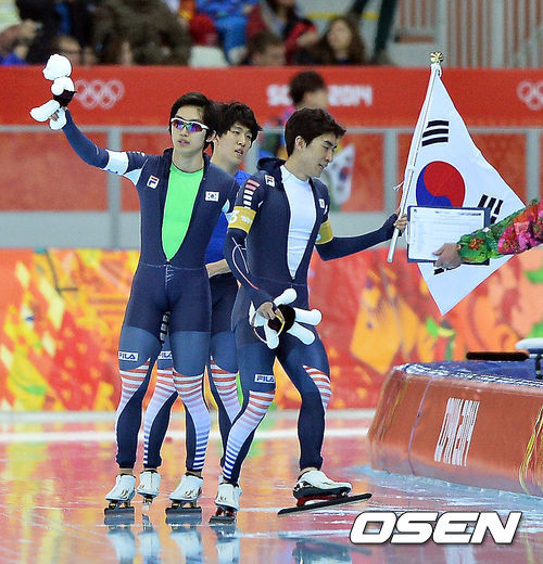 이승훈(26, 대한항공), 주형준(23), 김철민(22, 이상 한국체대)으로 구성된 스피드스케이팅 남자 팀 추월 대표팀(세계랭킹 2위)은 23일(이하 한국시간) 러시아 소치의 아들레르 아레나서 열린 팀 추월 결승 네덜란드(세계랭킹 1위)와 경기서 3분40초85로 결승선을 통과, 네덜란드에 패하고도 은메달을 획득했다. 네덜란드는 3분37초71로 올림픽 기록을 경신하며 금메달을 목에 걸었다.