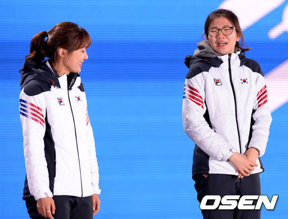 박승희, 심석희가 시상대에 올라 즐거워하고 있다.