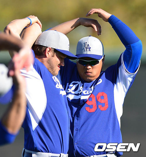 다저스 류현진이 클레이튼 커쇼와 스트레칭 훈련을 하고 있다.