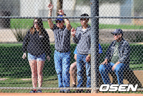 다저스 팬들이 훈련 중인 선수들을 바라보고 있다.