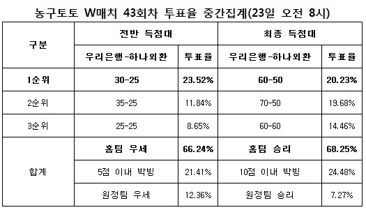 국민체육진흥공단(www.kspo.or.kr)이 발행하는 체육진흥투표권 수탁사업자인 스포츠토토 공식 온라인 발매사이트인 베트맨(www.betman.co.kr)이 오는 24일 오후 7시 춘천호반체육관에서 벌어지는 우리은행-하나외환전을 대상으로 한 농구토토 W매치 43회차 투표율을 중간 집계한 결과, 전체 참가자의 68.25%는 우리은행의 승리를 예상하는 것으로 나타났다.