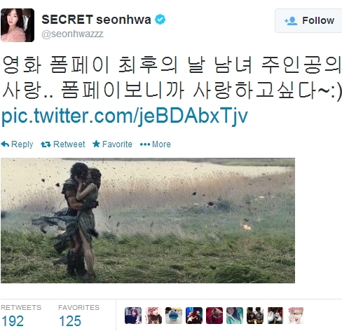 한선화는 23일 오후 자신의 트위터에 "영화 폼페이 최후의 날 남녀 주인공의 사랑.. 폼페이 보니까 사랑하고 싶다~"란 글과 함께 영화 '폼페이:최후의 날' 스틸 컷을 게재했다.