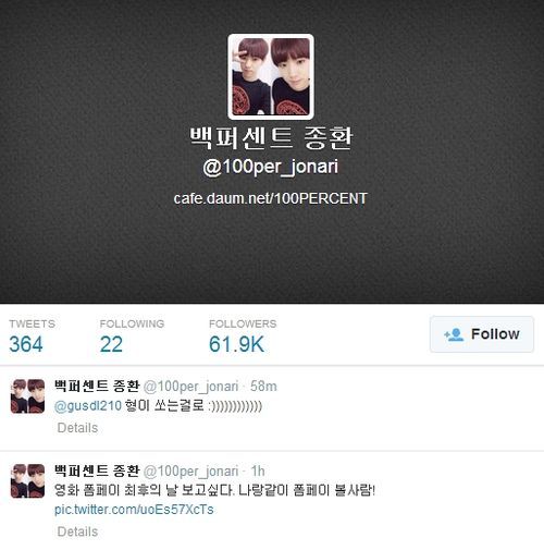 백퍼센트 종환은 23일 오후 자신의 트위터에 "영화 폼페이 최후의 날 보고싶다. 나랑같이 폼페이 볼 사람!"이란 글을 올렸다. 이에 록현이 "나!"라고 다정한 답글을 달았다.