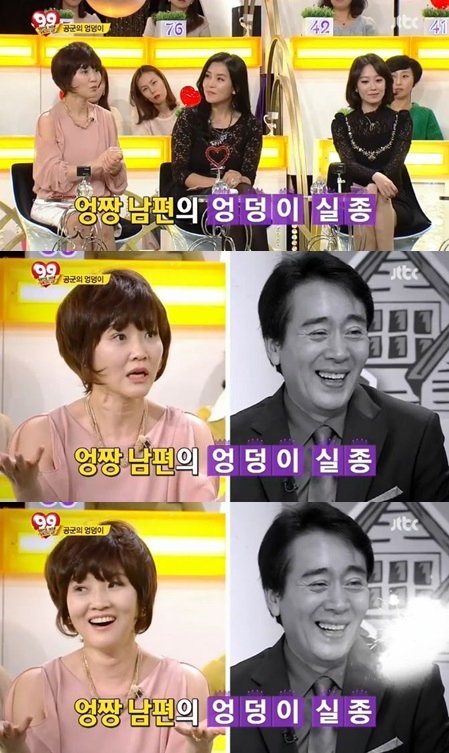 김미숙은 23일 오후 방송된 JTBC 예능프로그램 '99인의 여자를 만족시키는 남자(이하 '99만남')'에서 "내 남편의 엉덩이가 지금은 실종됐다"고 밝혔다.