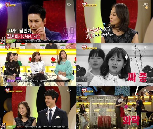 23일 첫 방송된 '99만남'은 99명의 돌싱녀(컴백녀)들이 자기 자랑을 하러 나온 부부들을 평가하는 프로그램. 출연자 아내가 자기 남편을 자랑하면 패널로 참석한 99명의 돌싱녀 판정단이 남편에 대한 점수를 매기는 방식이다. 가수 백지영과 배우 신은경, 방송인 문지애 등이 고정 출연해 MC 신동엽과 함께 대화를 이끌어간다.